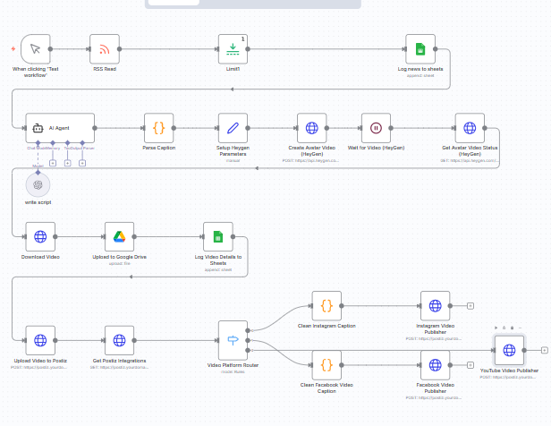 This workflow fully automates the creation and distribution of AI-generated news videos. It fetches news, generates engaging captions using GPT-4o-mini, creates AI avatar videos via HeyGen, stores them in Google Drive, and publishes them across Instagram, Facebook, and YouTube through Postiz.